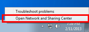 Right-click the network icon on the bottom-right side of Windows screen, and click "Open Network and Sharing Center" .