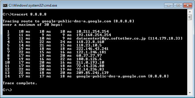 As the above figure, if the packet-path are through "10.211.254.254" , your communication is now relayed via one of VPN Gate Public VPN Servers.